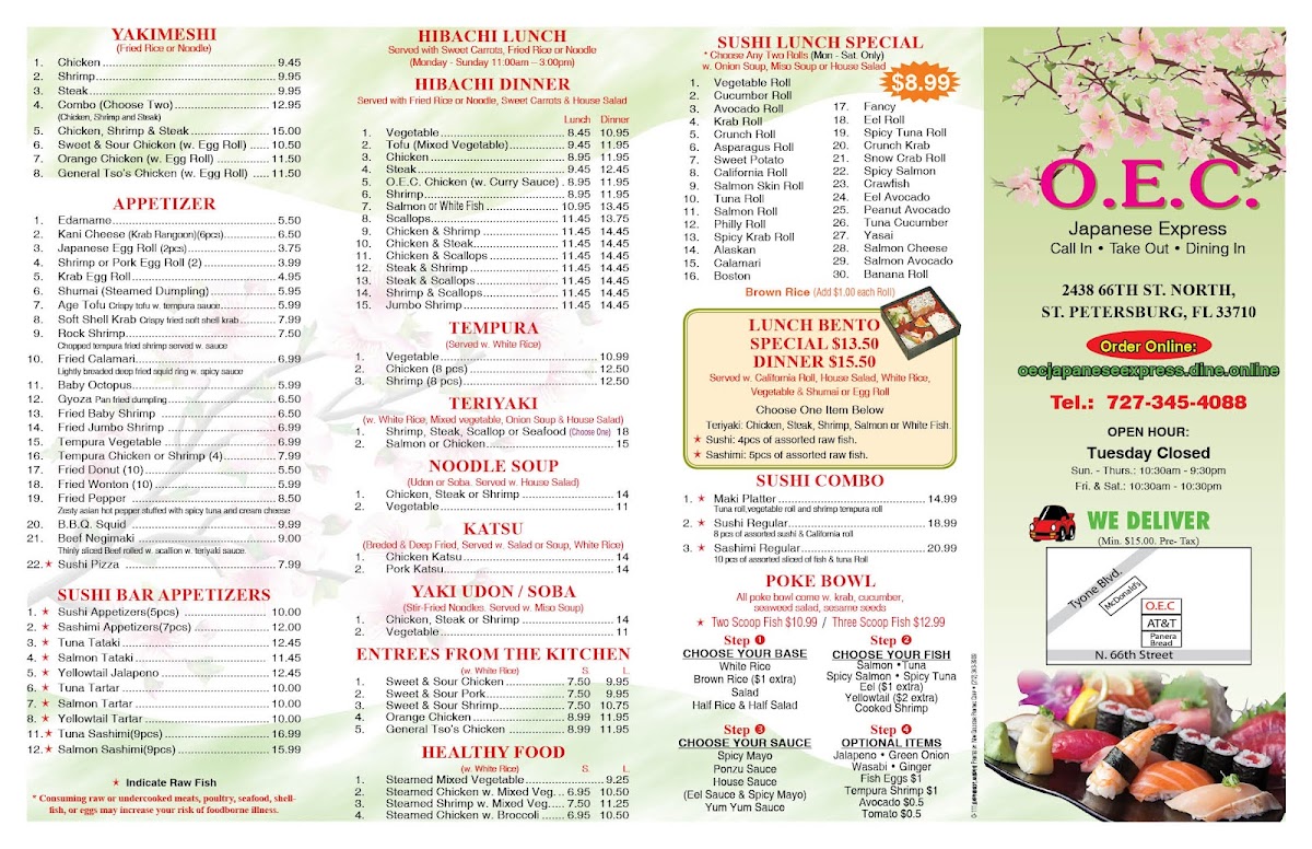 Welcome to O.E.C JAPANESE EXPRESS, a delightful hidden gem in St. Petersburg, Florida. This cozy eatery invites guests to experience authentic Japanese cuisine, emphasizing fresh ingredients and generous portions. With a well-rounded menu, the restaurant features enticing sushi options like the Unagi Don—BBQ eel atop seasoned rice for just $22, and the Sushi Paradise For Two at $75, perfect for sharing.